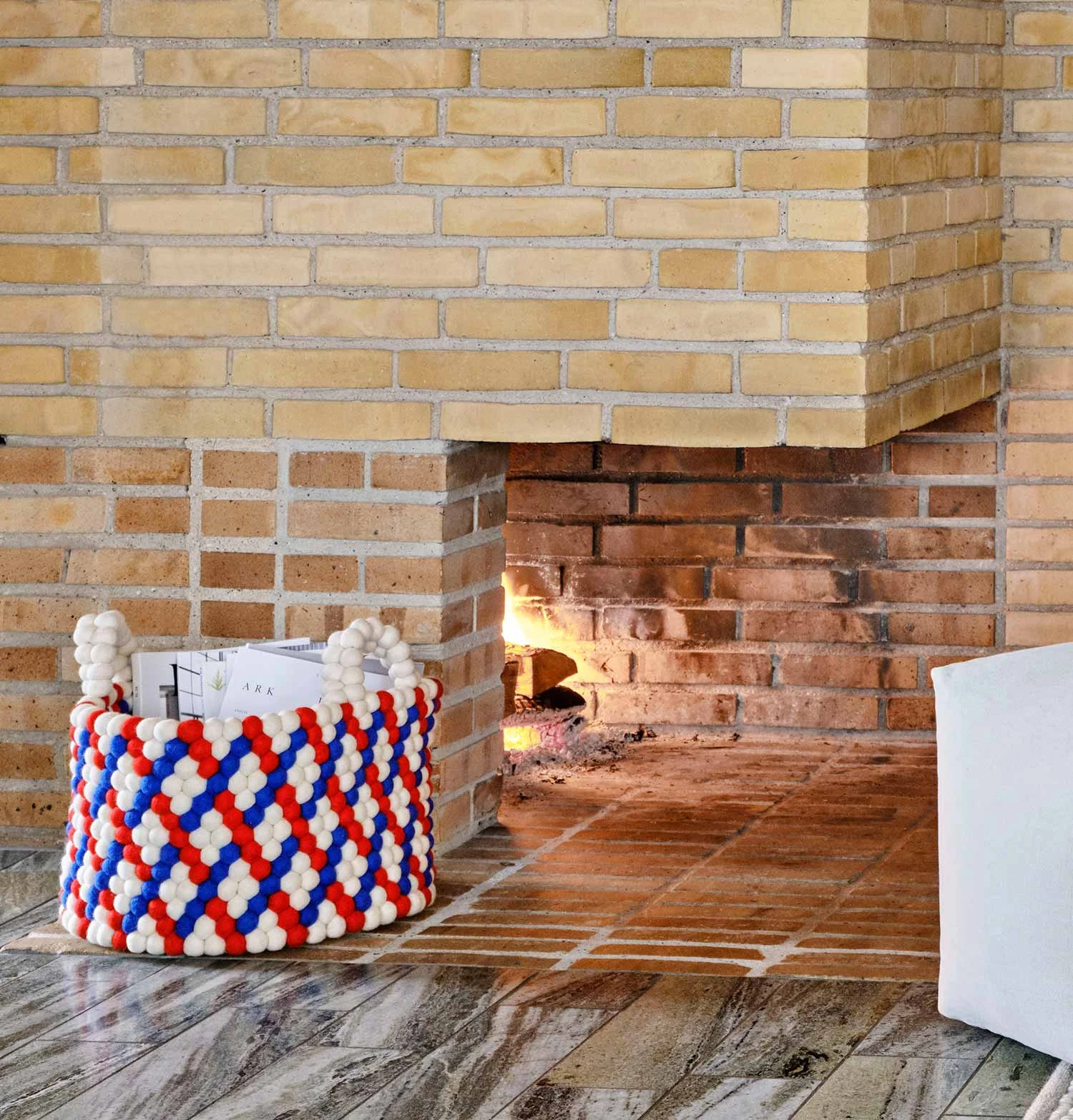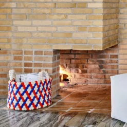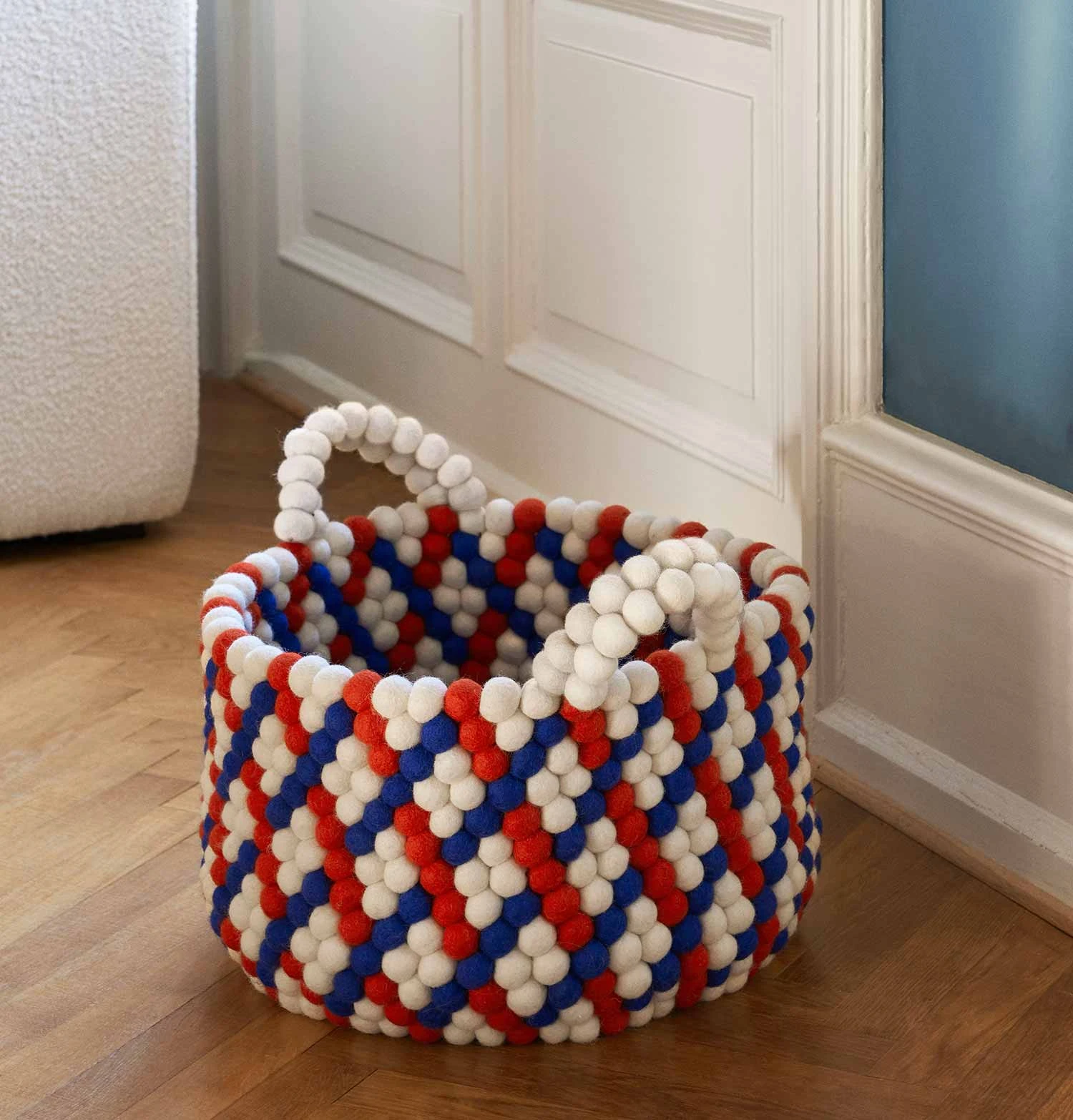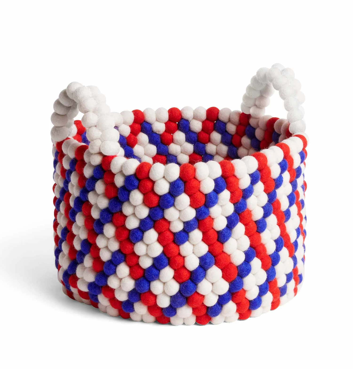 Handmade in Nepal using traditional craft methods, Bead Basket is made from hundreds of felt balls that are individually hand rolled into colourful graphic patterns, creating a distinctive and decorative storage solution for most rooms in the home. Available with or without handles in different designs and colours. Please note that as all our baskets are made by hand, they may vary slightly in size.