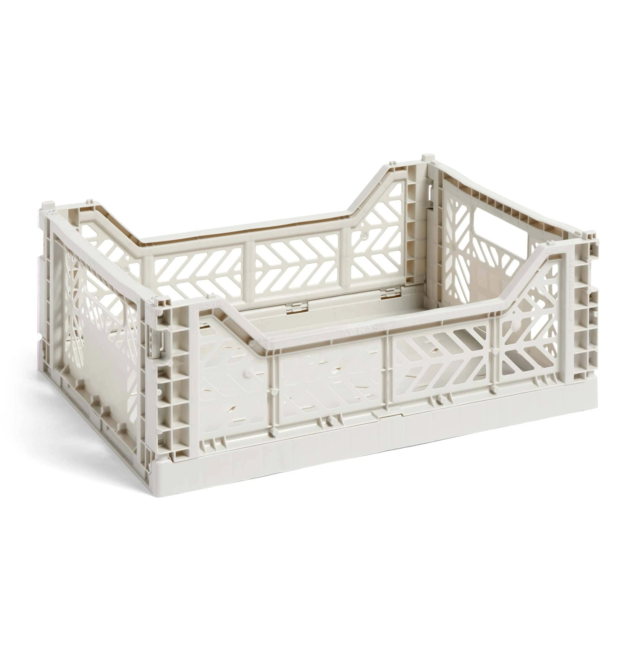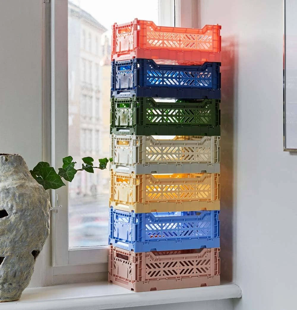 Multifunctional plastic crate with ventilated and stackable design in a variety of different colours and sizes.
