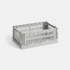 Multifunctional plastic crate with ventilated and stackable design in a variety of different colours and sizes.