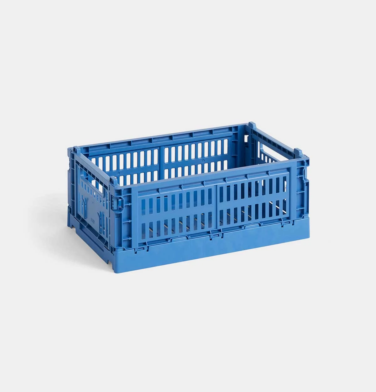 HAY Colour Crate is a series of colourful storage boxes with a distinctive, perforated design. Made from 100% recycled post-consumer plastic waste in a variety of different colours and sizes, the crates can be stacked on top of one another in different size combinations. The multifunctional crates are suitable for storing and organising a wide range of items on shelves, tables or inside cupboards.
