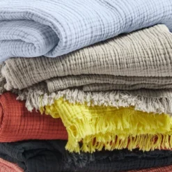 Crafted from a soft, lightweight cotton, the Crinkle Plaid features a crinkled texture and tasseled ends. Made from 100% cotton.