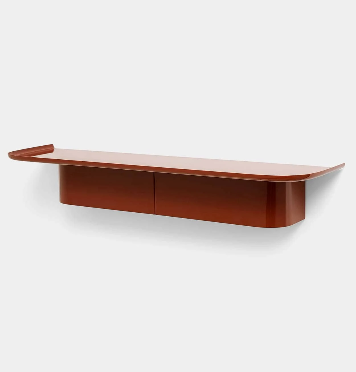 Korpus Shelf is a series of colourful wall-mounted shelves created for HAY by Norwegian product designer Andreas Bergsaker. Based on the desire to create a durable multi-purpose shelf from recyclable material, Korpus Shelf is made from sheet aluminium, known for its lightness, strength and ability to be reused countless times. The aluminium undergoes an industrial stamping and punching process to be formed into the distinctively curved column and top. Keyhole slits at the back facilitate mounting, while concealed hooks in the column provide additional hanging possibilities. Available in a wide range of sizes and colours, these versatile shelves can be used in many different rooms in the home, such as a coat rack in the hallway, storing kitchen utensils, hanging bathroom towels or displaying ornaments in the living room.