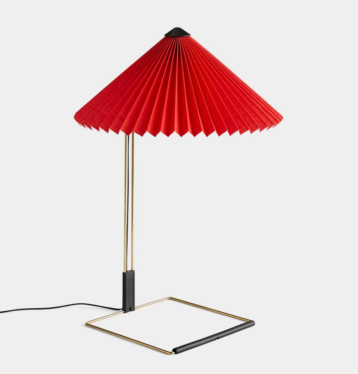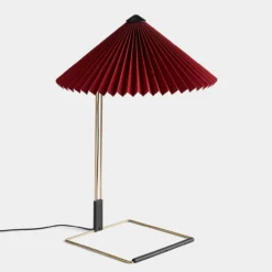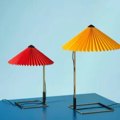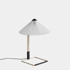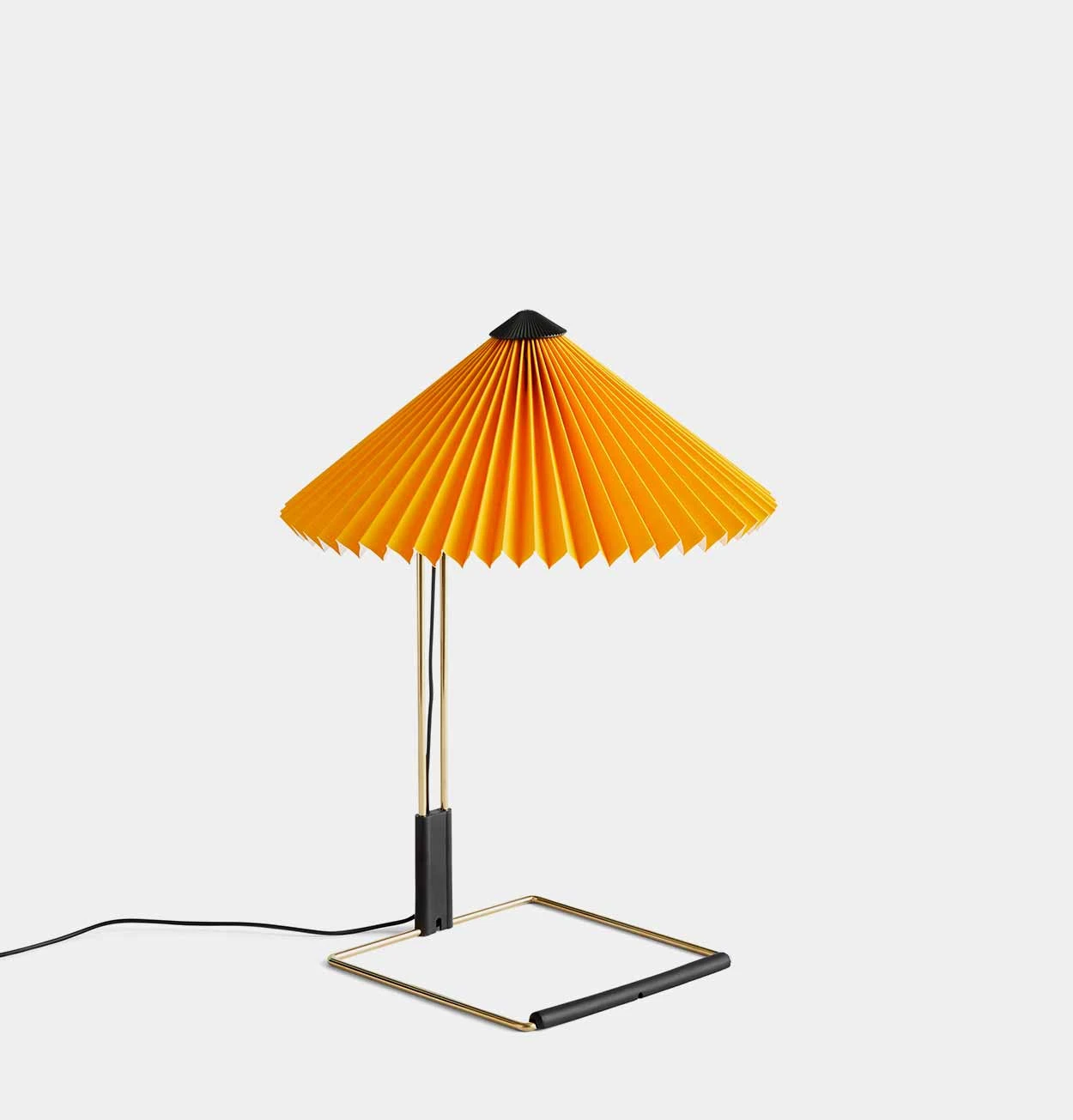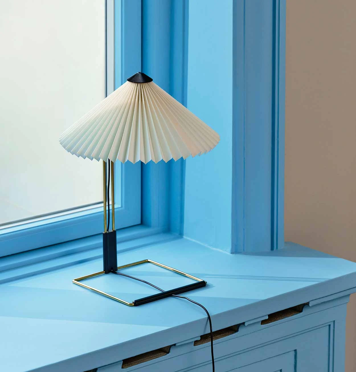 Designed by Inga SempΓ©, the Matin Table Lamp offers a contemporary yet poetic design, with a construction that combines visual delicacy with physical robustness. It consists of a steel wire bent frame finished in polished brass with matte black hardware and is paired with a pleated cotton shade in a variety of vibrant colours. The light source is an integrated LED, offering a diffused light which is accompanied by a digital in-line dimmer control to adjust the output of light if required.
