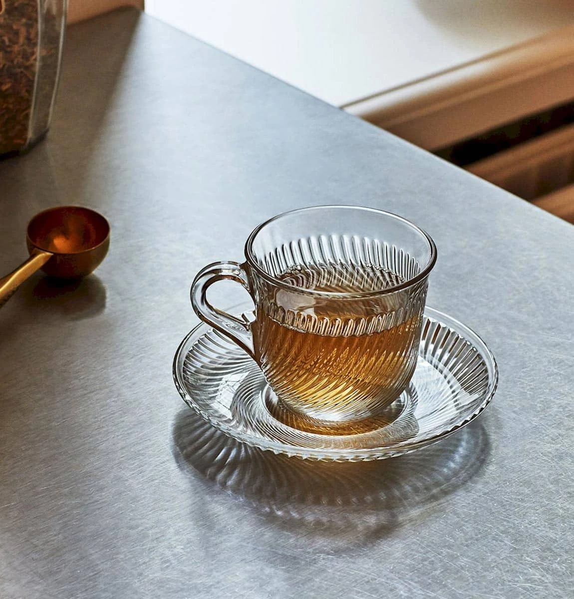 HAY’s Pirouette Cup and Saucer are made in clear glass and feature an all-over swirling ribbed pattern.