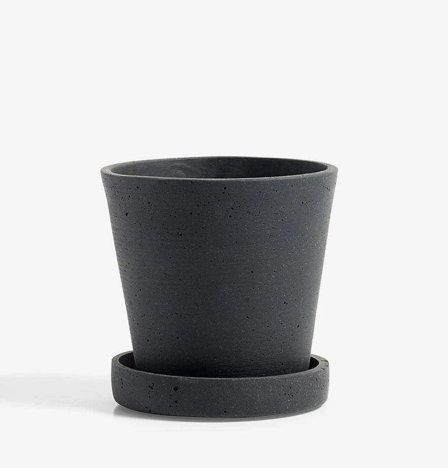 A minimalist HAY plant pot with saucer made from polystone – a cross between stone and plastic which gives a rough, organic finish similar to concrete.