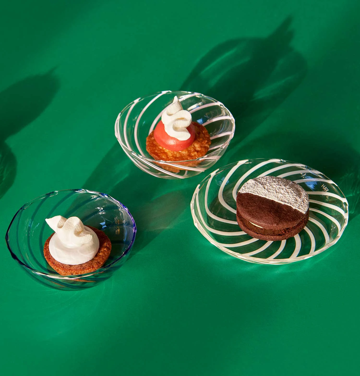 Coloured borosilicate glass with a swirling pattern creates an elegant and distinct design in HAY’s Spin. Ideal for serving food, storing small objects or just for decorative purposes.