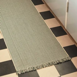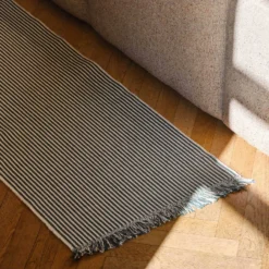 Comprising bold vertical stripes in contrasting colours, the Stripes and Stripes rug collection features a clean, graphic design that creates the illusion of extra length. Made of durable cotton with fringed ends, it is available in a variety of lengths and colour combinations.